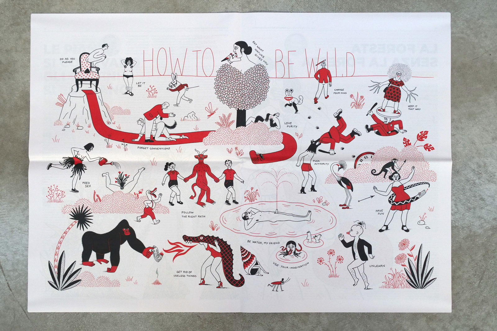 Magazine inedito firmato Il Lazzaretto, realizzato in collaborazione con l’illustratrice catalana Luci Gutiérrez e interamente dedicato al tema del Selvaggio, Il Sabato del Selvaggio prende le mosse da Der Struwwelpeter (in italiano Pierino Porcospino), libro culto per l’infanzia scritto dallo psichiatra tedesco Heinrich Hoffmann nel 1845. Seguendo il tema di riferimento, e mantenendo lo sguardo sulla dicotomia ordine/disordine, tutti gli articoli del Magazine hanno a che fare con l’essere selvaggio e con il suo contrario (ovvero la repressione o l’addomesticamento degli istinti): dal protagonista “fauve” e perturbante del celebre manuale di Hoffmann, il percorso si snoda attraverso alcune delle più importanti figure della pedagogia e della letteratura di genere, dal mito del “ritorno alla natura” nell’Emilio di Rousseau alla sessualità selvaggia e ribelle di Borroughs in The wild boys, alla bioenergetica di Alexander Lowen, fino ai più famosi bambini-selvatici della letteratura per ragazzi (Mowgli, il Max di Maurice Sendak in Nel Paese dei Mostri Selvaggi, ma anche Pippi Calzelunghe, Pinocchio, Mafalda), fino ad arrivare al punto di vista di artisti e autori contemporanei (Kiky Smith, Ryan McGinley e molti altri).